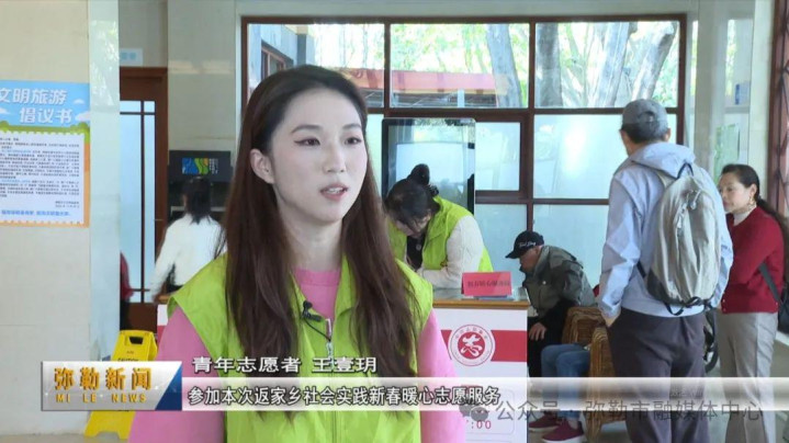 [青年志愿者王壹玥]:身为一名大二学生,参加此次返家乡社会实践新春暖心志愿服务。一方面,希望锻炼自身能力,另一方面,是对弥勒的热爱,尽己所能为弥勒宣传助力,为八方游客提供周到的便民服务,让他们在弥勒畅享美好旅程。
